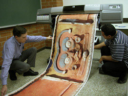 Nicholas Hellmuth and an assistant, appreciating the print in wide format size of a rollout of a Quiche burial urn.
